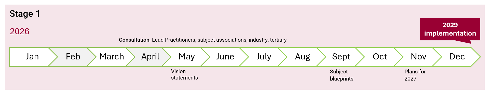 The following is an expected timeline of when key artefacts are created, and other communication, consultation and governance milestones. This timeline will remain flexible and responsive to the needs of specific subjects.