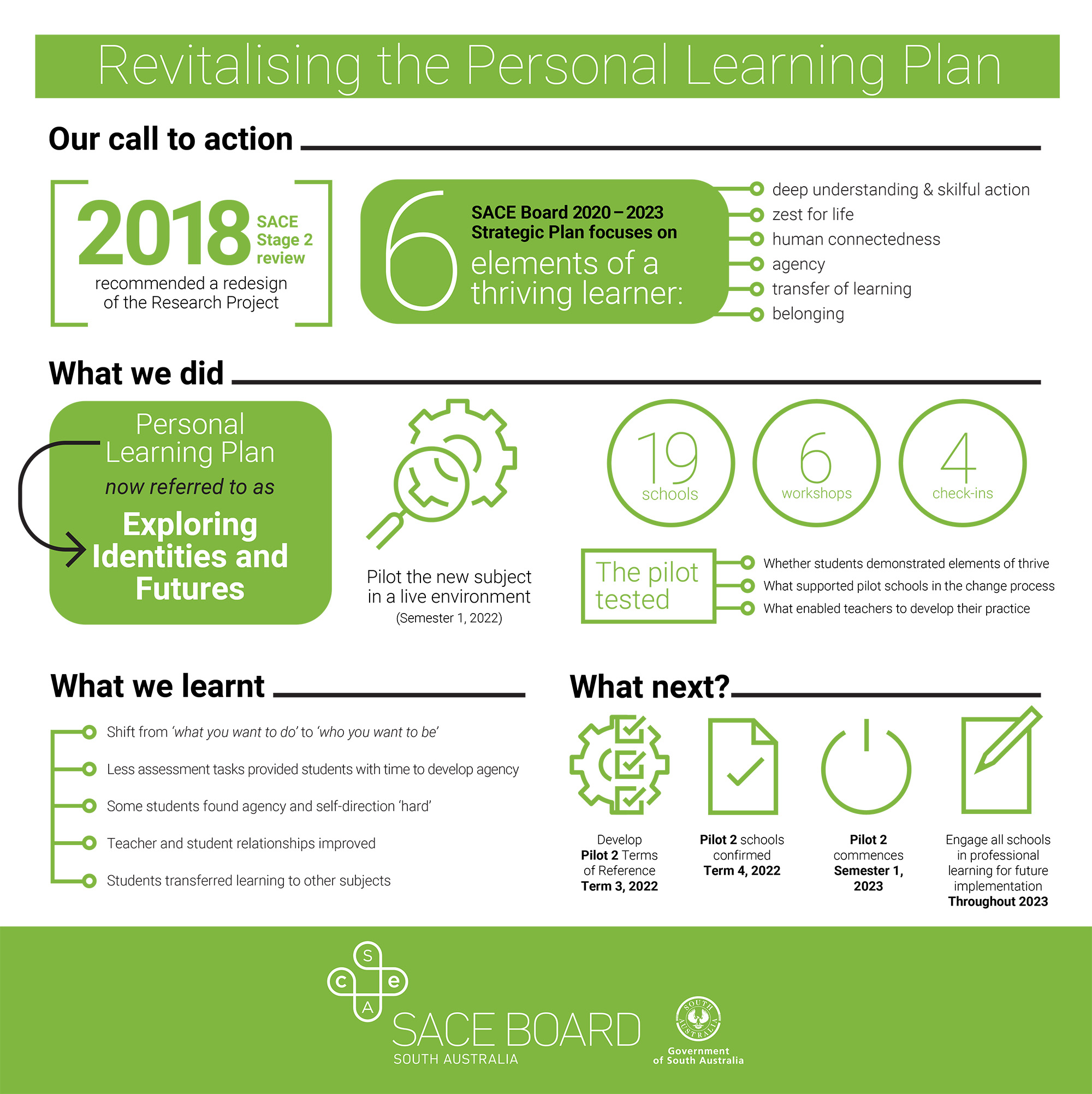 Following feedback received from schools and the community in the 2018 SACE Stage 2 Review [PDF 172KB] the SACE Board began to redesign Stage 1 Personal Learning Plan (PLP), to be replaced with Exploring Identities and Futures (EIF).