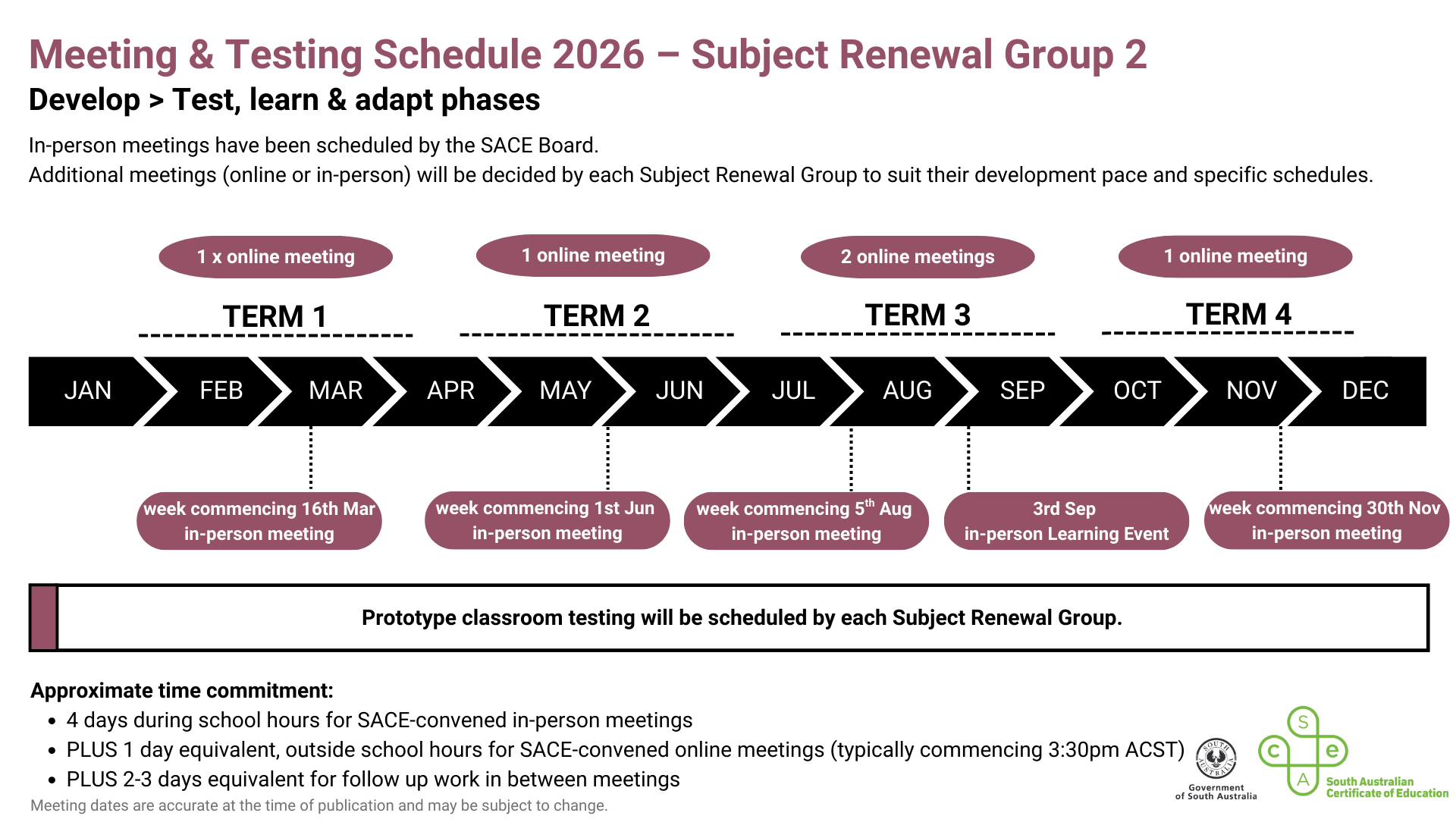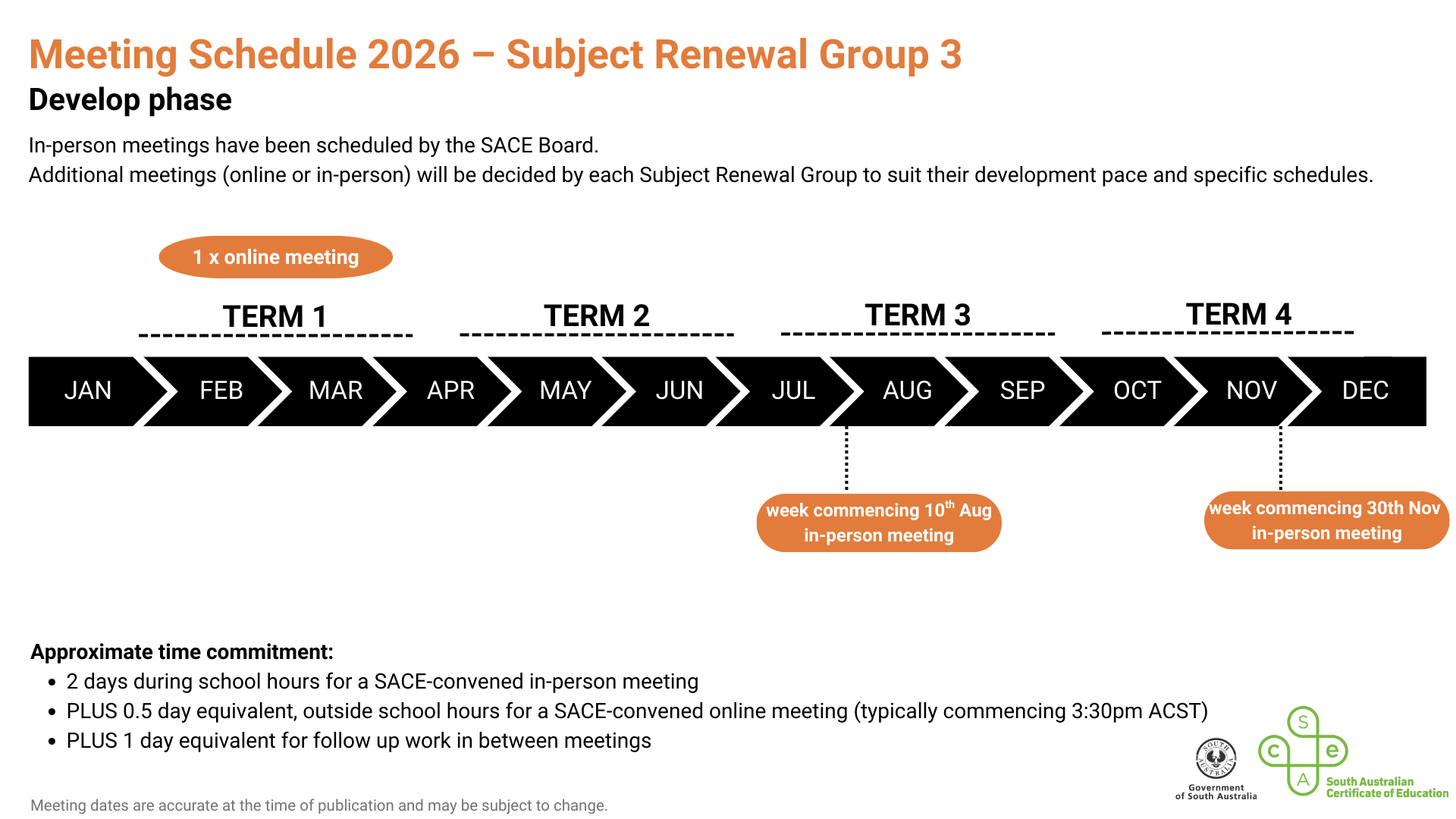 2 days during school hours for a SACE-convened in-person meeting. PLUS 0.5 day equivalent, outside school hours for a SACE-convened online meeting (typically commencing 3:30pm). PLUS 1 day equivalent for follow up work in between meetings.
